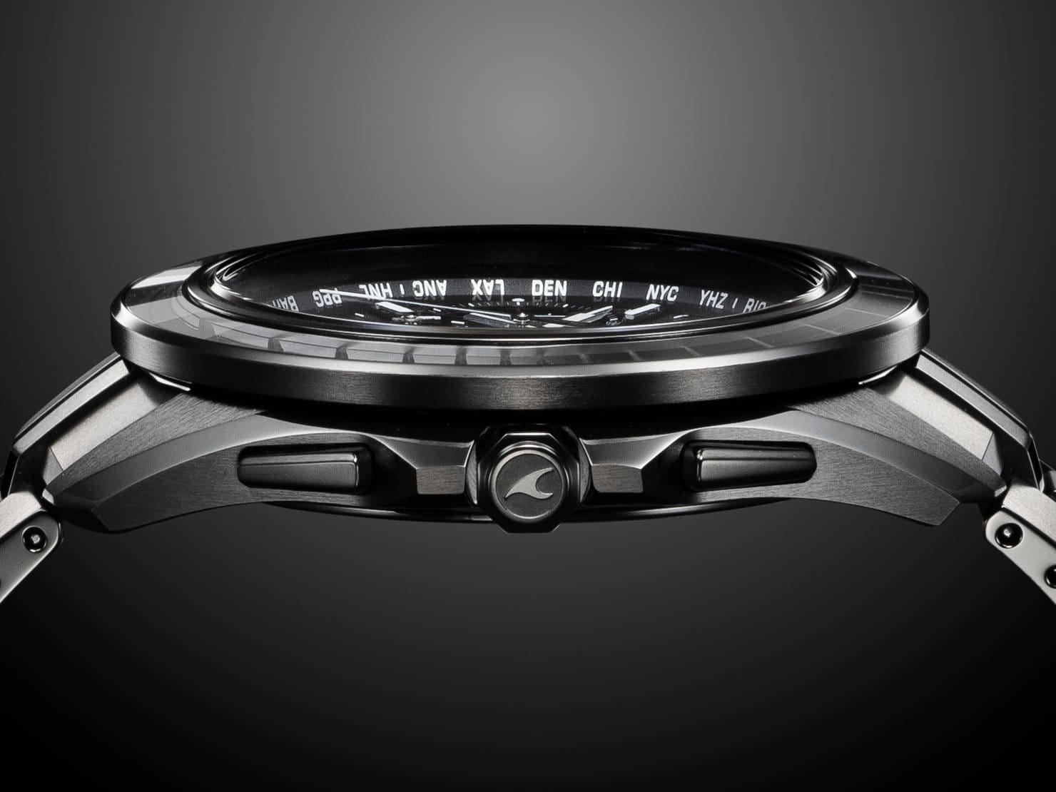 The OCW-S7000CN-1AJF captures this motif through its “Thousand Lines” pattern — a precise lattice of cuts that refract light in subtle blue hues, depending on the angle. The all-black DLC-coated titanium case and bracelet reflect the night sky’s depth, while the matte lunar-textured dial adds a tactile sense of quiet detail. Inside, it runs on Casio’s Tough Solar system with Bluetooth connectivity, MULTIBAND6 radio control, and world time for 27 cities. At 9.8mm thin and 81 grams, it’s remarkably lightweight yet undeniably premium.