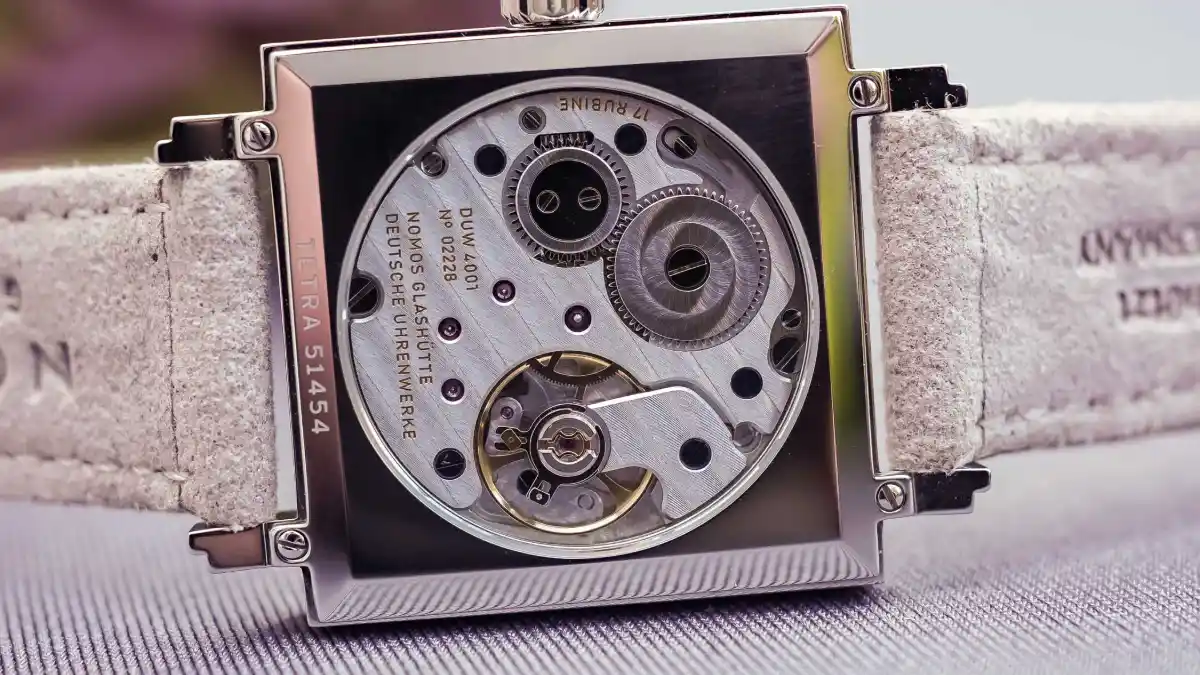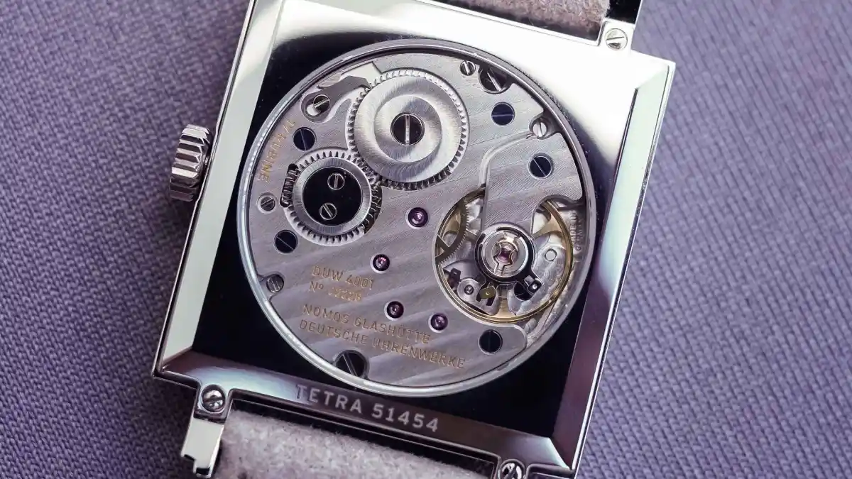 Under the hood, the new Tetra Origins runs on the brand’s DUW 4001 calibre, a refined hand-wound movement based on the classic Peseux 7001 architecture. The key upgrade? Nomos’ very own Swing System escapement, which officially makes this movement 100% in-house. It beats at 21,600 vibrations per hour and offers 43 hours of power reserve — pure mechanical charm, no battery required. Through the sapphire caseback, you can admire traditional German watch finishing: blued screws, Glashütte ribbing, gold engravings, and perlage detailing.